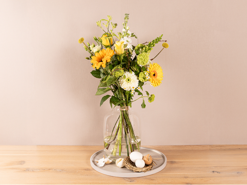 Fris paasboeket in geel, wit en lichtgroen, losjes geschikt met speels groen en hoogteverschil.