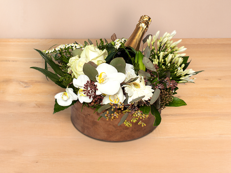 Creatief arrangement met fles bubbels