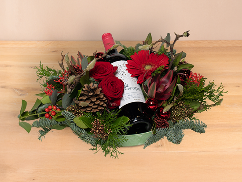 Rood kerstarrangement met fles biologische rode wijn.